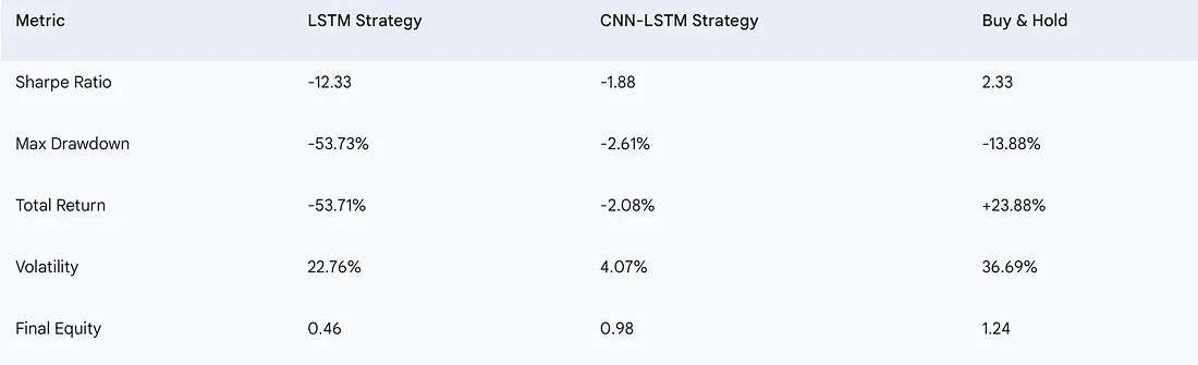 是的,你没看错。这两个本应复杂的模型彻底失败了,无法盈利。LSTM策略不仅糟糕;它是一个壮观的暴跌,烧掉了超过一半的初始资本。CNN-LSTM模型,祝福它的混合心脏,做得好一点——它基本上持平。但“持平”在简单的“买入并持有”策略能带来+23.88%的情况下,是一种冷酷的安慰。这是一颗难以吞咽的药丸,尤其是在投入了这么多时间和精力之后。