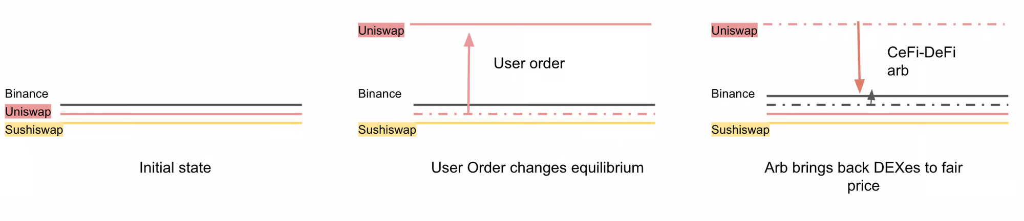 当链上价格因大额交易而变动,或当链下价格变动而链上价格保持停滞时(例如,链下价格在区块之间变动),就可以进行CeFi-DeFi套利。