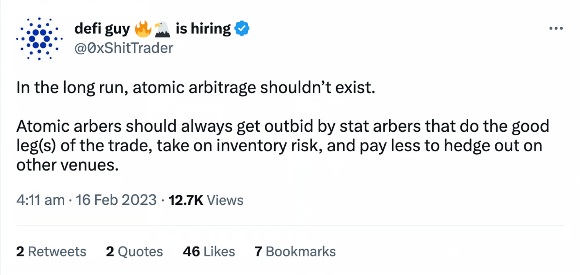 原子套利是在单一、孤立的事件中进行的,因此得名。要么所有交易步骤都被执行,要么都不执行。套利立即发生,交易者在两个交易步骤之间不持有库存,使这种策略在对冲库存方面无风险。此外,链下搜索器基础设施(PoW下的Flashbots拍卖和PoS下的区块构建者私有RPC)保证了回滚保护;也就是说,失败的交易不会上链,对交易者没有任何成本。由于上述两个原因,这种策略在理论上是无风险的,进入门槛低。