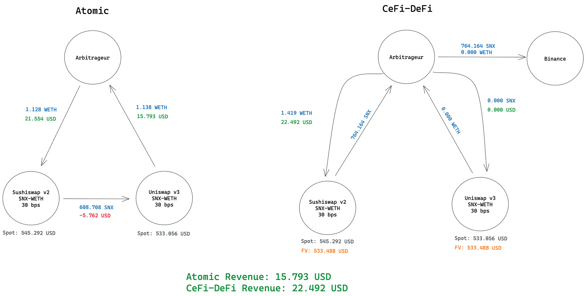 原子套利和CeFi-DeFi套利之间的关键区别在于公允价值的概念。这意味着,理论上,由于以下原因,CeFi-DeFi套利将拥有更高的市场份额: