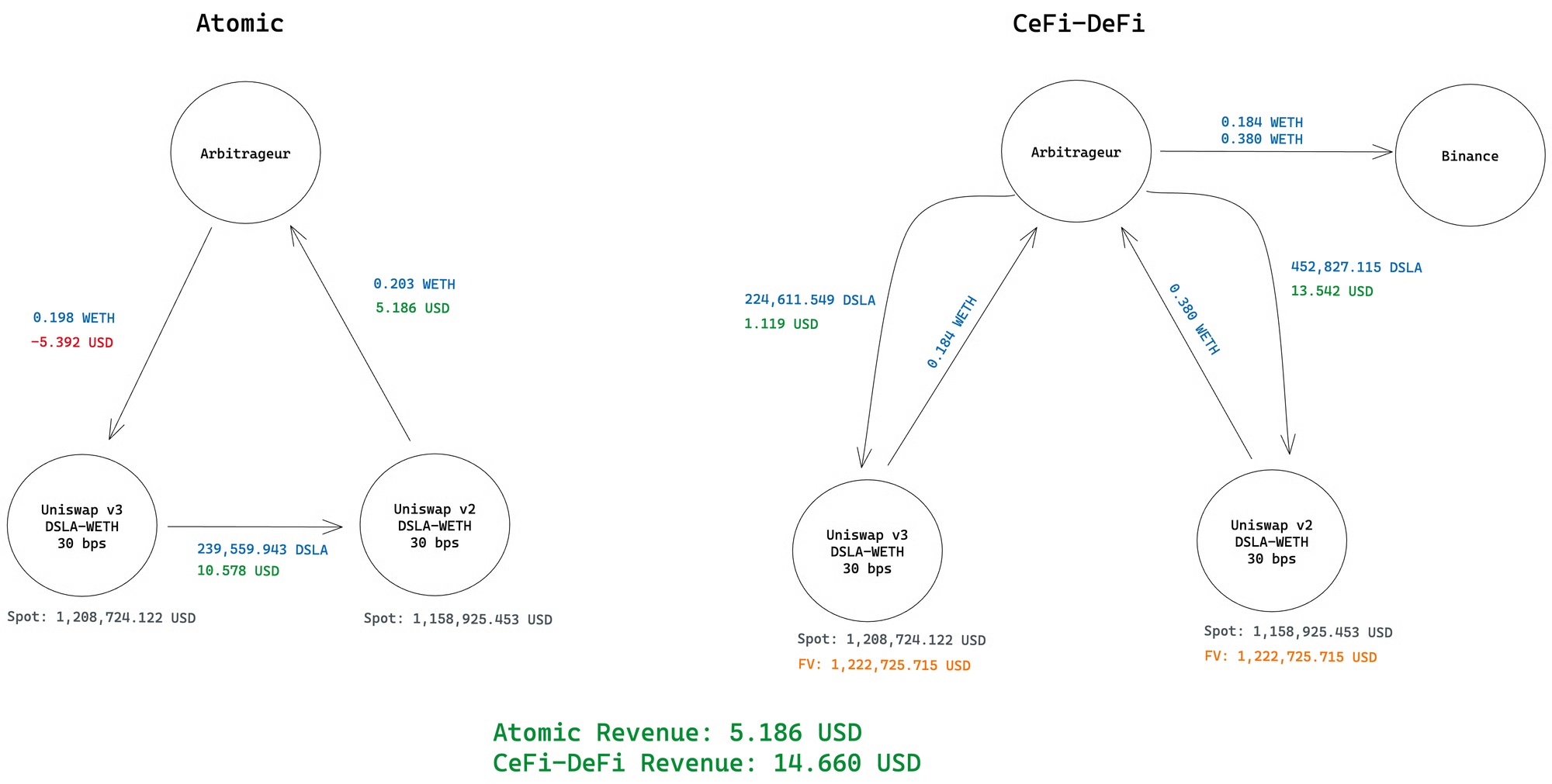 - 一个原子套利者通过这个差异赚取了21.55美元的收益步骤,支付了5.76美元的对冲成本。