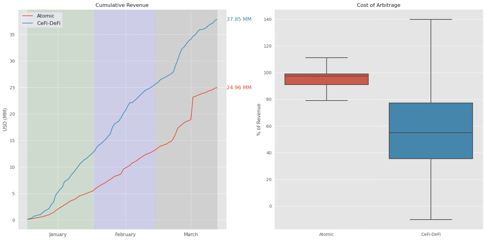 2023年第一季度原子套利和CeFI-DeFi套利的比较。CeFi-DeFi在2023年第一季度产生了3780万美元的收入,而原子策略产生了2500万美元的收入。原子套利收入的91-99%支付给验证者以纳入,而CeFi-DeFi收入的37-77%支付给验证者以纳入。原子交易来自EigenPhi。