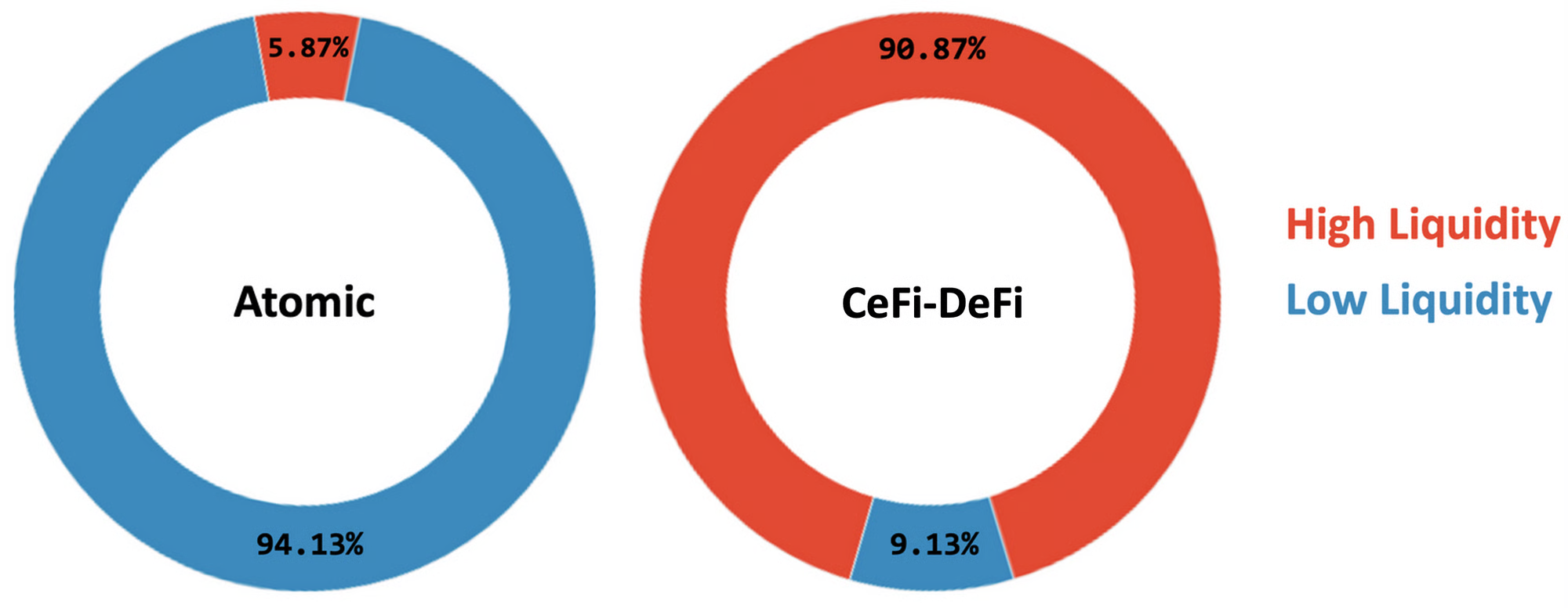 95%的原子套利机会是在低流动性代币上执行的,即套利至少包含一个低流动性代币。91%的CeFi-DeFi机会是在高流动性代币上执行的,即套利中的所有代币都是高度流动的。