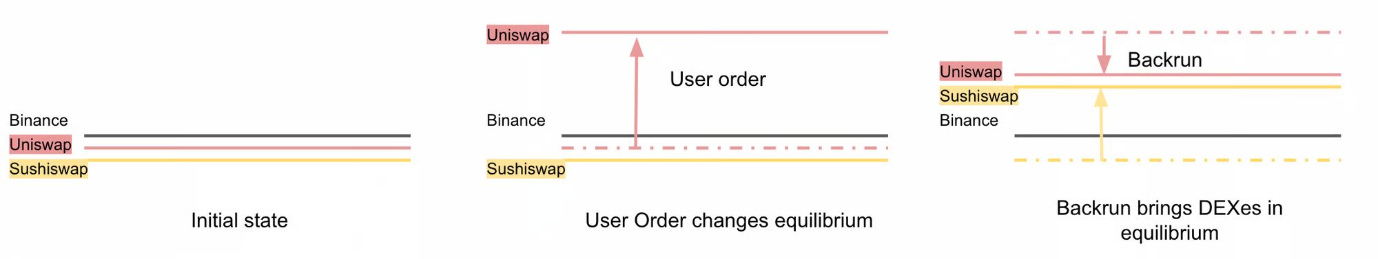 原子套利是我们看到的最早的MEV机会之一。原子套利的最简单例子是当一个交易对在多个DEX上以不同价格列出时。下面的图片展示了原子套利策略如何在两个链上DEX上交易,直到价格达到平衡。