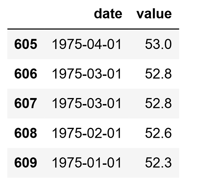 如您所见,我们收到的数据是每月的。CPI不是每天计算的指数;它由美国劳工统计局(BLS)每月发布,这在本文的范围内。