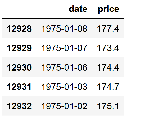 如您所见,对于黄金,我们有每日价格,所以首先要做的就是合并这两个数据框,但只保留每月初的黄金价格。这有点棘手,因为当月初(我们有CPI价格)是周末时,我们将没有黄金价格。我们将使用merge_asof
