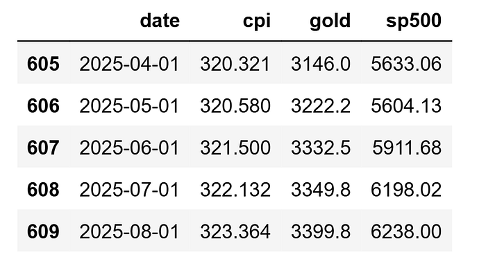 df_backtest = df_backtest[['date', 'cpi', 'gold', 'sp500']]