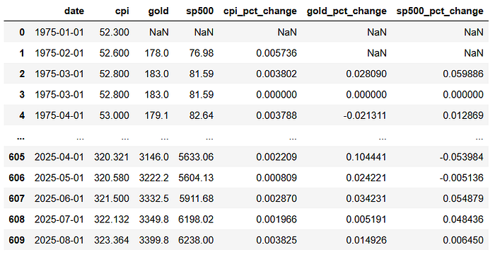 如您所见,我们现在有了一个完美的月度数据框,其中CPI和黄金的价格已经对齐。