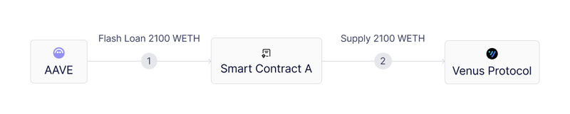 最初,攻击者通过AAVE的闪电贷借入2100 WETH,随后将这些代币存入Venus协议以增强借贷能力。