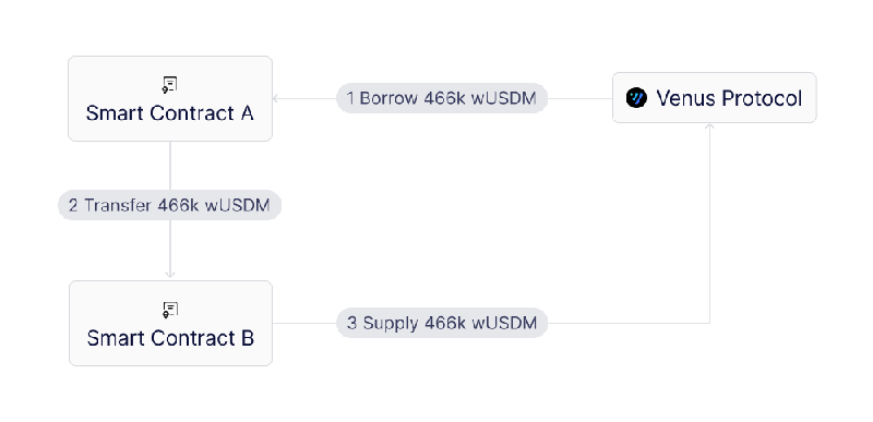 - 账户A从Venus池中借入466,000 wUSDM,并将这些代币转移到账户B。