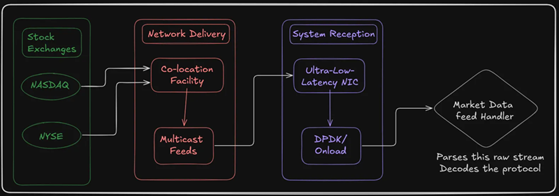 一切始于市场数据——来自纳斯达克或纽约证券交易所等交易所的实时报价、交易和订单簿更新。