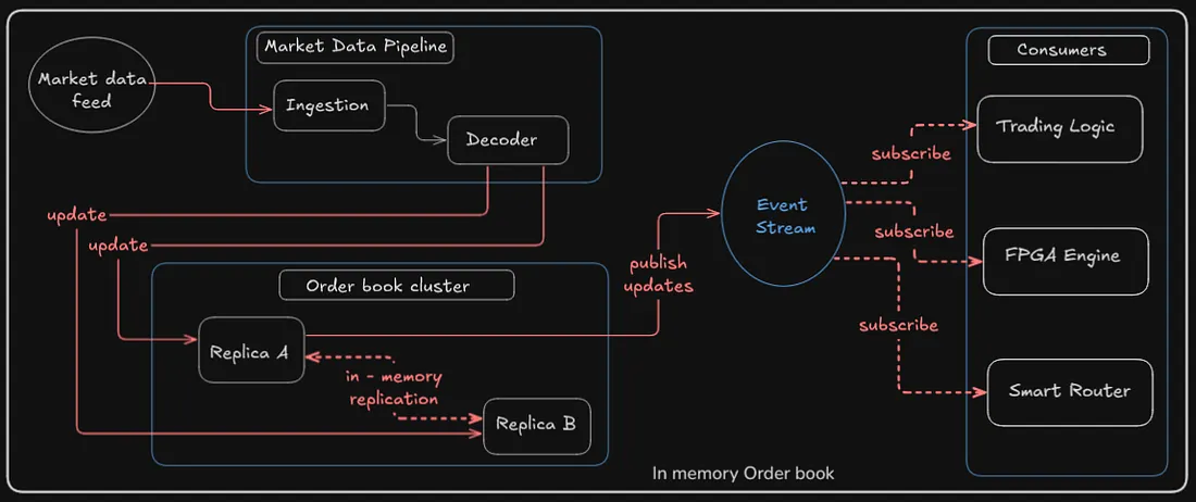 解码后,更新被输入到订单簿中,这是当前市场深度(买入价、卖出价和数量)的内存模型。