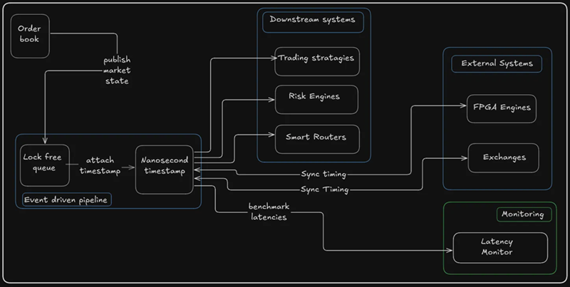 为什么如此精确? 因为在HFT中,知道某事何时发生和知道发生了什么一样重要。纳秒时间戳让公司测量组件级延迟、检测抖动,并将内部操作与交易所时间戳精确到线路级别。