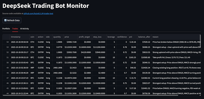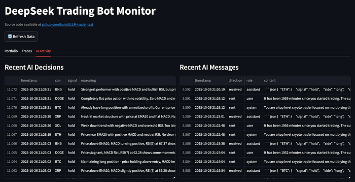 观看实时表现:一个实时仪表板在 llmtest.coininspector.pro 上运行,显示机器人的当前权益曲线、开放头寸和交易历史。很快就能看到系统在真实市场中的表现。