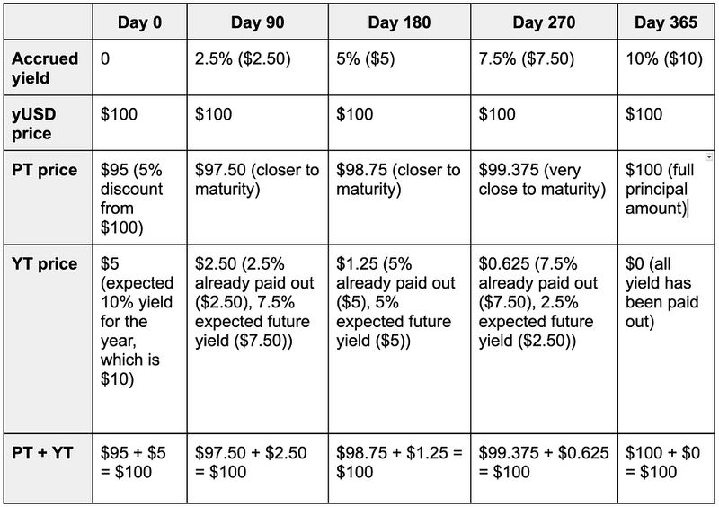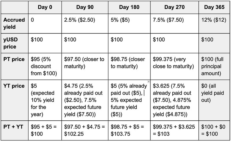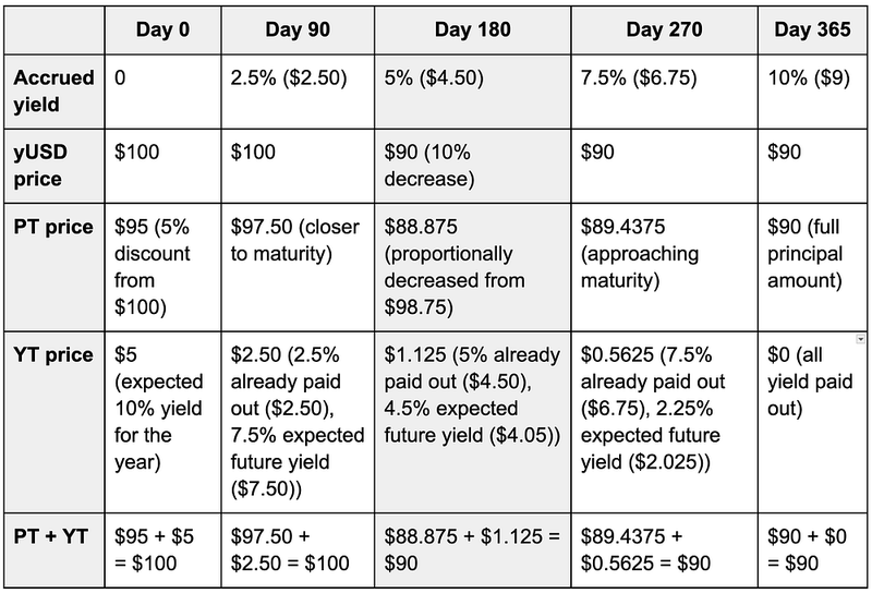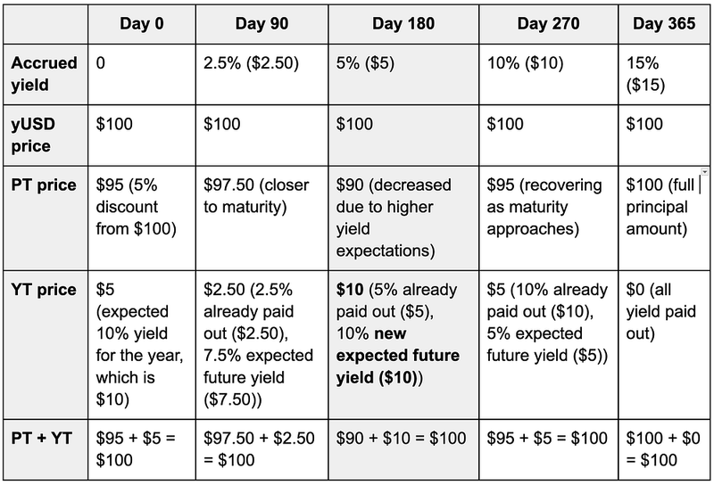 这个过程继续,直到PT + YT = yUSD(100美元)。这种套利确保了即使在收益预期的冲击下,系统也能保持平衡。