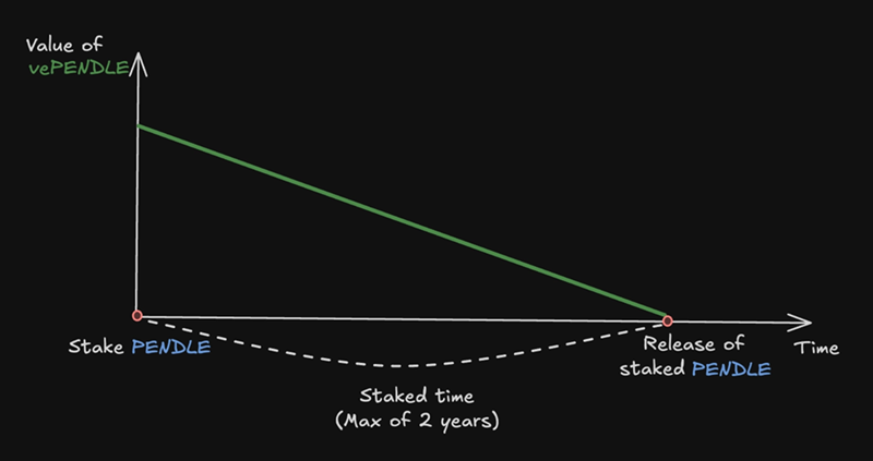 重要! 用户的 vePENDLE 余额每周减少,直到锁定期结束时变为零,类似于 Curve 使用的 veCRV 模型。这一模型已被许多其他协议采用。
