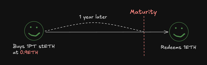 重要的是要理解,stETH是一个产生收益的代币,由于质押奖励,其价值相对于基础ETH增加。购买PT代币时,只能以ETH而不是stETH进行1:1的兑换,而stETH相对于ETH的价值继续增长。