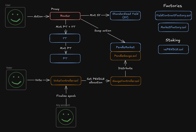 代币,该协议开发并提出了自己的标准——ERC-5115: SY代币,它扩展了ERC-20,具有必要的包装功能(存款、提款等)。