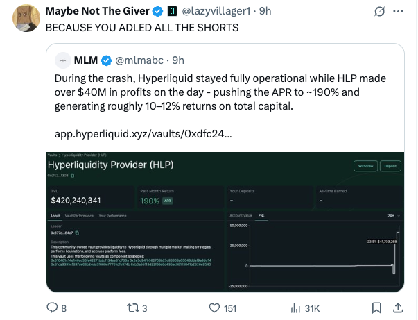 在中心化交易所 (CEX) 上,我从未遇到过强行平仓的盈利交易,除非是直接清算。说实话,我知道庄家总是想赢。但据报道,Hyperliquid 在这次暴跌中印了 4000 万美元,因此拒绝给予用户应得的收益未免太过分了。