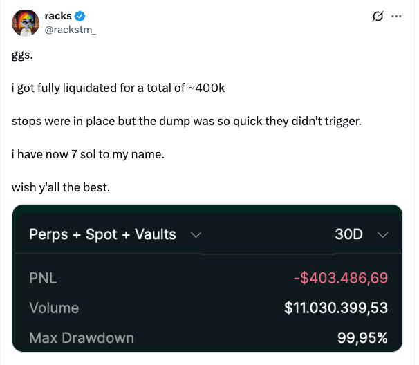 像$HYPE这样的主流山寨币暴跌了50%。Solana下跌了25%。比特币一度触及10.2万美元。暴跌如此严重,以至于即使是持有1.2倍杠杆的人,也可能在某些山寨币上亏损。
