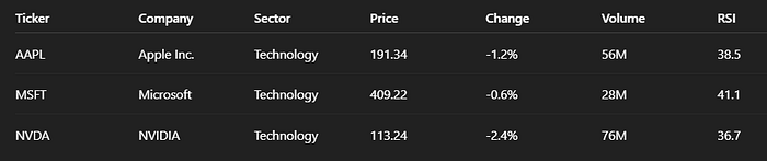 # 示例:合并 RSI(来自 Finviz)和 P/E(来自 EODHD)