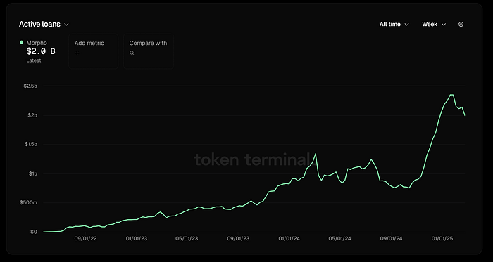 尽管最初明显落后于像 Aave 和 Compound 这样的行业巨头,Morpho 成功地将其活跃贷款组合扩展到了自 2022 年以来的 20 亿美元。仅在 2025年1 月份,该项目就赚取了 2000 万美元的费用,使 Morpho 处于一个可以维持甚至加速增长的有利位置。