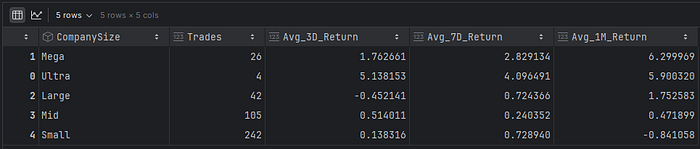 当基于公司规模进行分组时,首先是大型公司。“超大型”公司(如AAPL、NVDA、MSFT等)只有4次购买。但为什么没有内部人士购买这些股票?显然这不是原因。我看到的更重要的原因是,这些公司的内部人士已经持有大量股权,他们也不觉得有必要购买股票来表明对公司信心...