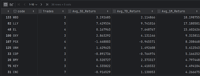 虽然回报相当平衡(列“AverageReturn (%)”),但我们可以清楚地看到,只有购买(交易代码 = P)略具盈利性。这是因为出售可能出于与公司表现无关的原因(税收、个人流动性等)。