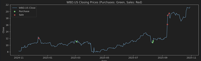 让我们详细查看交易。在下面的图表中,我将用红色显示销售,用绿色显示购买。