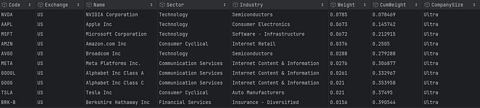 使用EODHD API获取标普500成分股,我将检索该指数的所有股票。此外,我还将丰富数据框,加入公司的规模,以便在分析过程中利用此信息。