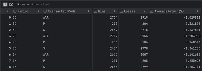 {'Period': period, 'transactionCode': 'S', 'Wins': wins_s, 'Losses': losses_s, 'AverageReturn(%)': avg_s})