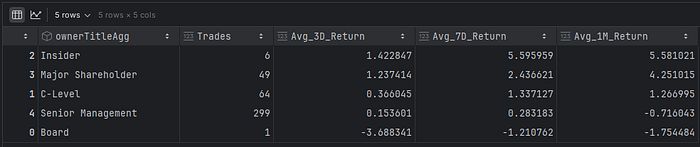 现在让我们根据每个内部人士的头衔来检查回报。从这一点开始,我将只专注于购买。