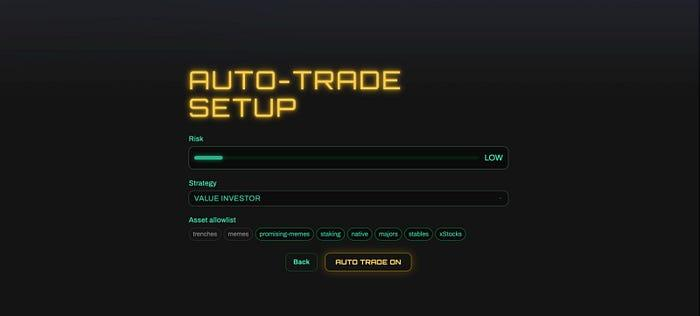 设置出乎意料地简单。我选择了一个中等风险等级,选择了波段交易策略,并挑选了一些模因币和已确立的Solana代币。