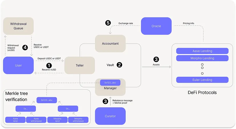 此外,Merkle树验证增加了一层安全性,因为由于每个金库可以执行的操作——无论是部署流动性、质押还是重新平衡——都被预先注册、哈希并嵌入到Merkle树中,因此不可能发生任意交易或策略更改。