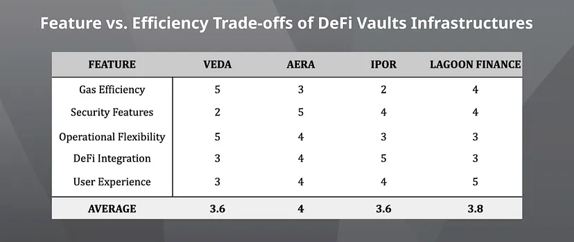 为了全面了解这些基础设施,我们在1到5的尺度上评估了它们的关键特性,其中5代表最高性能。此分析突出了效率、安全性和可用性之间的权衡,揭示了每个协议如何平衡相互竞争的优先事项。Veda在gas效率和操作灵活性方面表现出色,但在安全特性方面有所欠缺,而Aera则优先考虑安全性,牺牲了gas优化。IPOR在DeFi集成方面表现突出,而Lagoon Finance在用户体验方面领先。总体平均显示Aera得分最高(4.0),紧随其后的是Lagoon Finance(3.8)、Veda(3.6)和IPOR(3.6)。