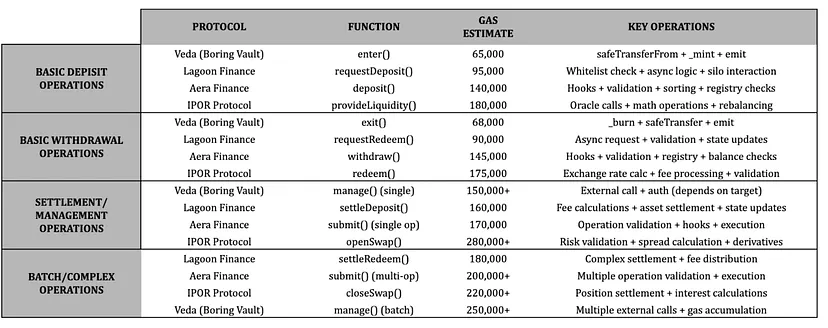 gas成本是DeFi可用性的一个关键因素,尤其是对于频繁的操作,如存款、取款和重新平衡。我们分析了这些协议中常见功能的估计gas使用情况,按操作类型分类。估计基于典型的EVM执行,并突显了架构选择如何影响效率。Veda的BoringVault始终表现出最低的gas使用量,这是由于其极简设计和将逻辑卸载到外部合约,使其非常适合高频零售互动。相比之下,IPOR和Aera由于预言机调用、验证和复杂钩子而产生更高的成本,这增强了安全性和灵活性,但可能使成本敏感的用户望而却步。Lagoon Finance处于中间位置,异步逻辑优化了批量操作。