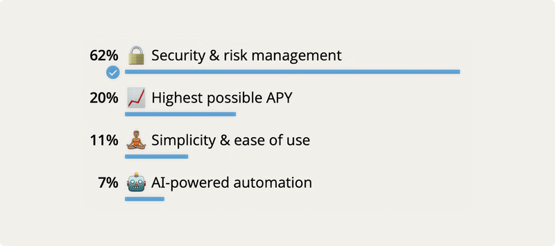 在我们社区最近的一项民意调查中,62%的用户将安全性和风险管理列为选择DeFi金库(Vault)时的首要优先事项。