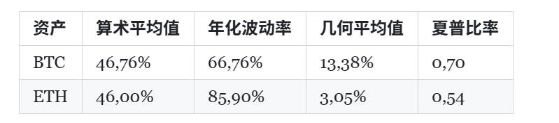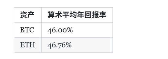虽然历史回报很容易计算,但预期未来回报却很难估计。查看BTC和ETH的平均年回报率: