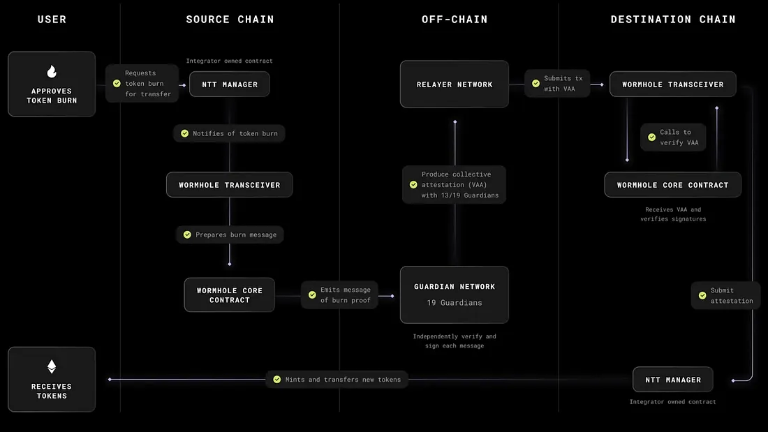 Wormhole 的 Core Contracts 和 Transceivers 作为标准化的消息传递层存在——它们不持有资金(除非充当锁定金库),而是仅在 NTT Managers 和 Guardians 之间传递消息。