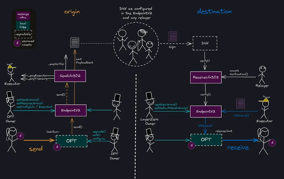 消息传递的核心依赖于 LayerZero 的 Endpoint 合约——它们管理发送和接收库(如何发送/接收消息的可插拔逻辑)、本地存储的消息以及配置如要信任哪些 DVN。