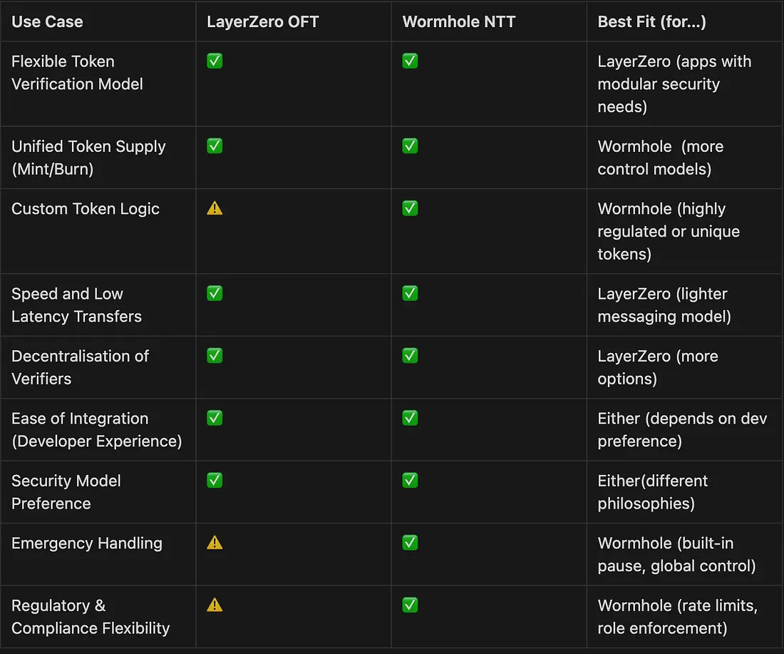- 如果你需要跨链覆盖(包括Solana/Cosmos)、细粒度控制或受监管或高价值代币的备用机制,请使用Wormhole。